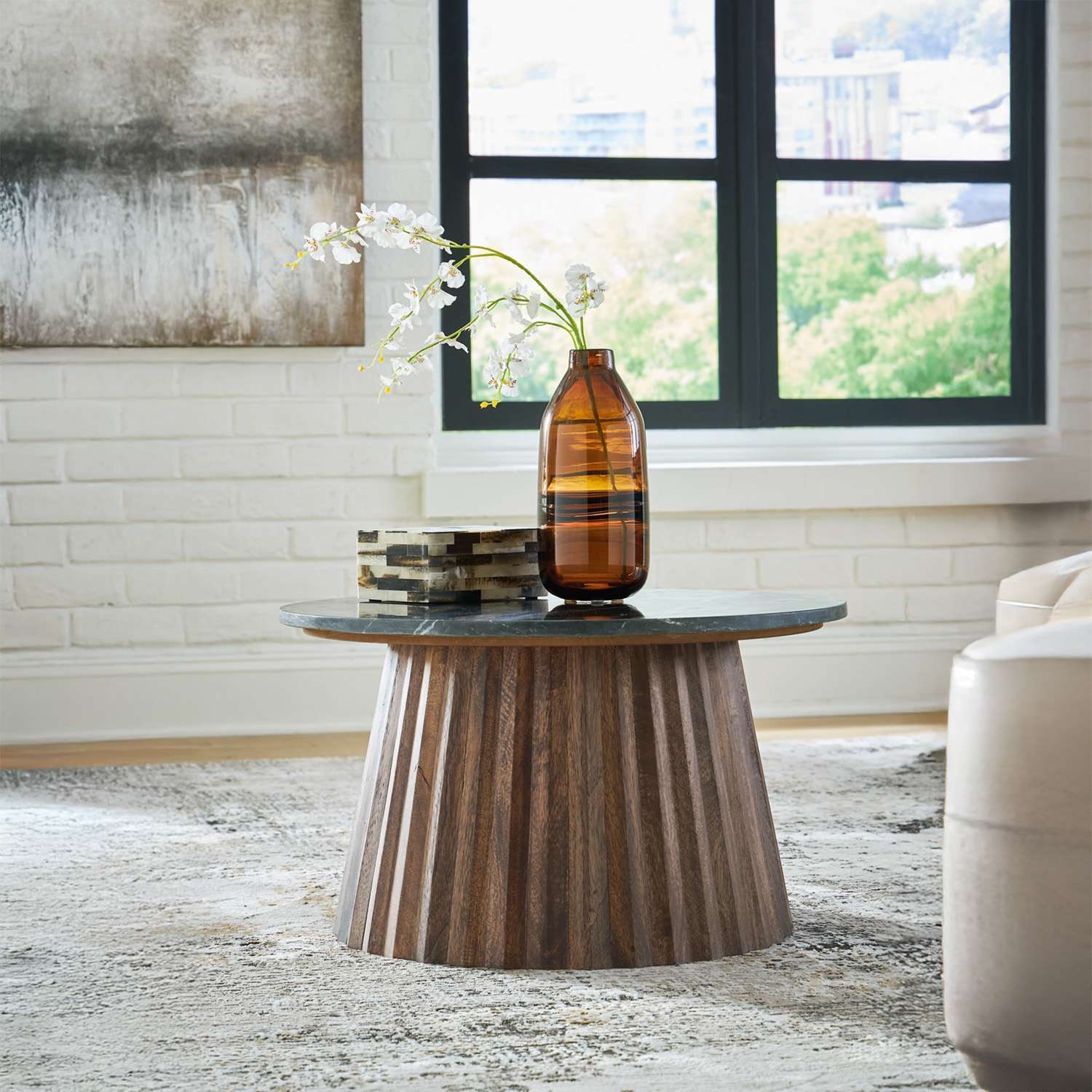 Entertain your besties with ease with this contemporary coffee table. Designed for the modern tastemaker, the mixed-material accent piece wows with a marble top and a fluted wood base. This organic beauty can be used on its own or grouped with other pieces in the collection.