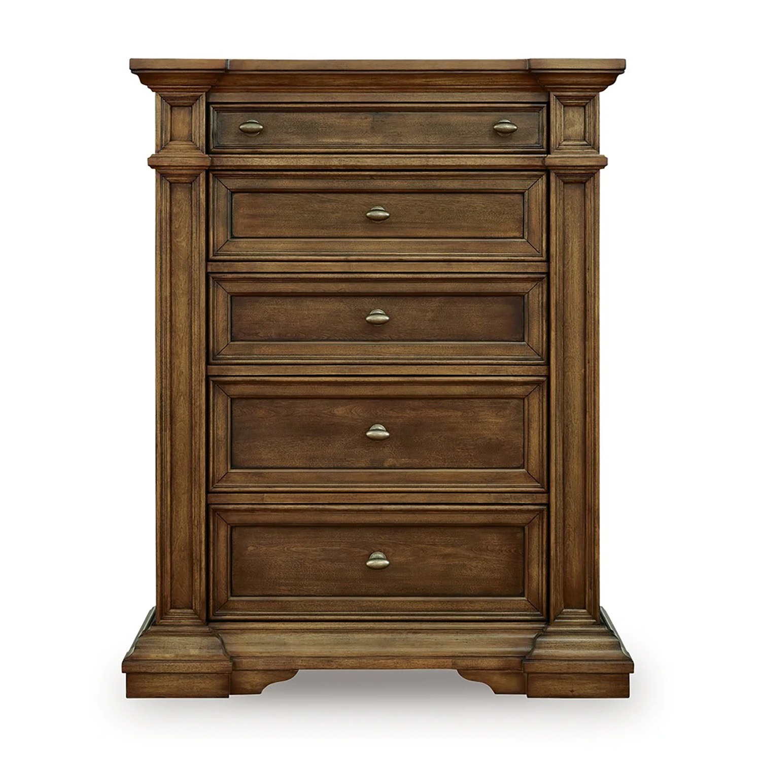 Time-honored style, made for today’s home. This chest of drawers pays homage to traditional aesthetics, with a richly detailed finish incorporating a sense of stately elegance. Substantially-scaled moulding details and antiqued brass-tone knobs round out the piece in graceful fashion.