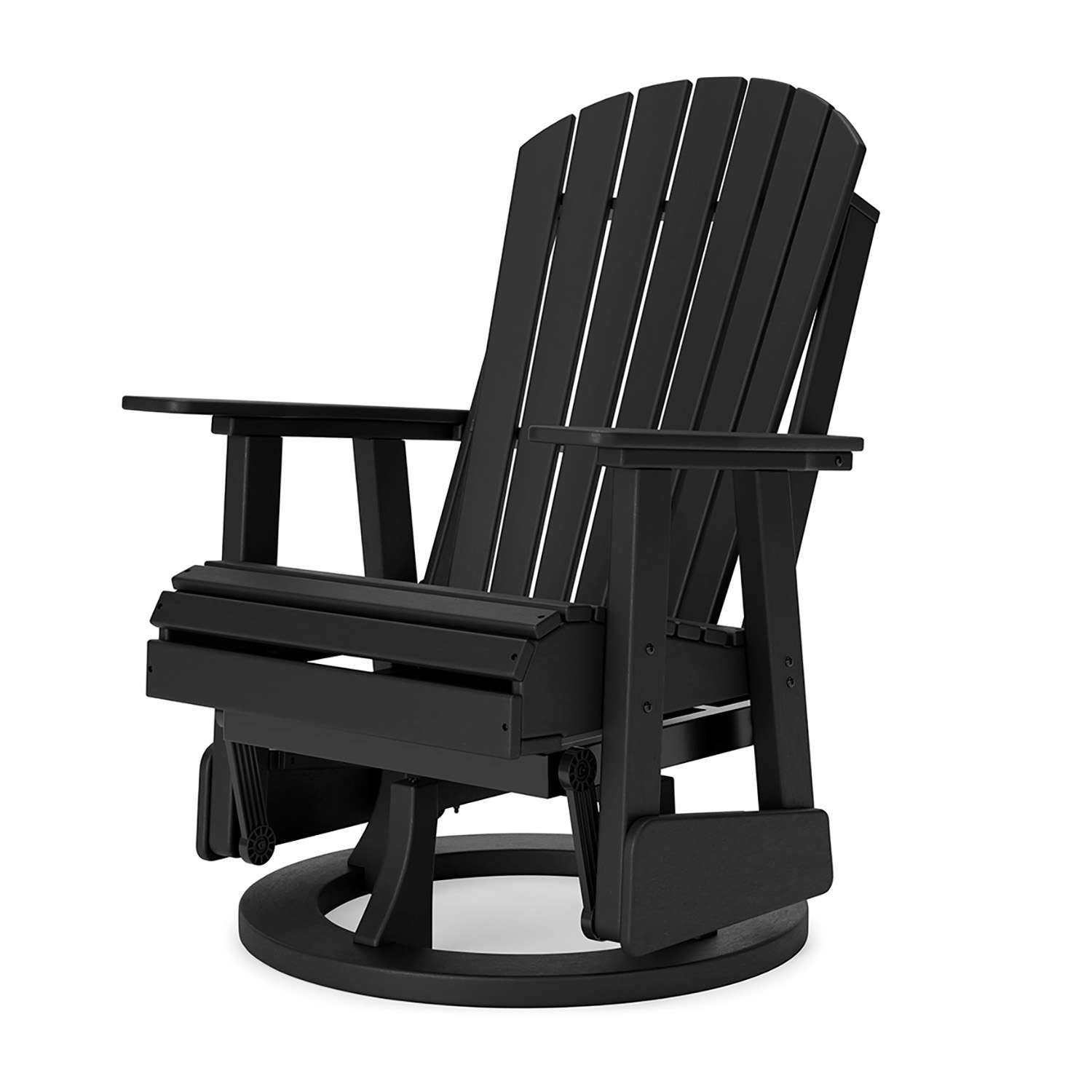 Drift away from everyday worries and into outdoor bliss with this swivel glider chair. Dressed in a smart black, the Adirondack-inspired design has a contemporary feel. It weathers sunny summer days and cozy winter nights with durable MEGA-TUFF® HDPE material. When it comes to form and function, the chair’s 360-degree swivel and rain-shedding slatted design simply go with the flow.