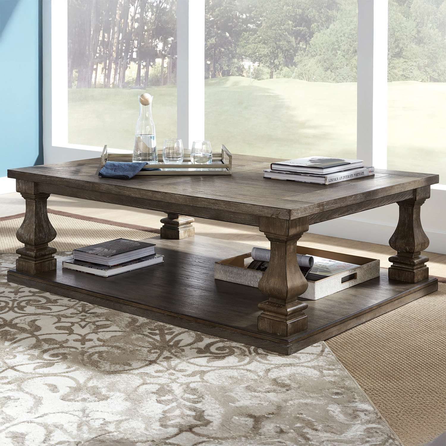 Homey. Hearty. Heavenly hued. Luring with a distressed weathered gray finish and square baluster legs set on a broad lower shelf for great presence, this coffee table is sure to make your homestead feel that much more like home. The look is beautified with elm veneers and a framed and plank-effect tabletop for a richly crafted masterpiece made for years of satisfaction.