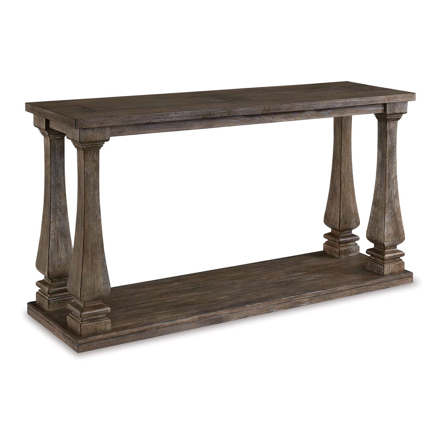 Homey. Hearty. Heavenly hued. Luring with a distressed weathered gray finish and square baluster legs set on a broad lower shelf for great presence, this sofa table is sure to make your homestead feel that much more like home. The look is beautified with elm veneers and a framed and plank-effect tabletop for a richly crafted masterpiece made for years of satisfaction.