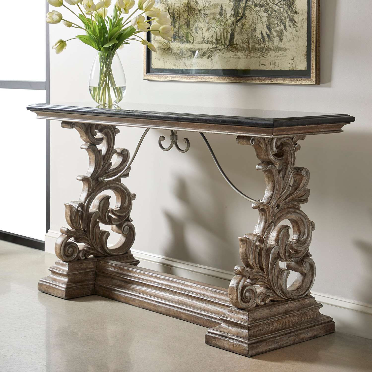 Intricate detail and exuberant design unite to create a luxurious piece in this Italianate-styled Marble top Console Table, featuring a black marble top with an ogee edge supported by a trestle base displaying detailed carving. An ornate metal stretcher exhibits beautiful scrollwork underneath the tabletop, adding more elegant detail to this piece. Whether used in an entry or behind a sofa, this marble-top console table can be an ideal addition to almost any room in your home that could become an heirloom that lasts centuries.